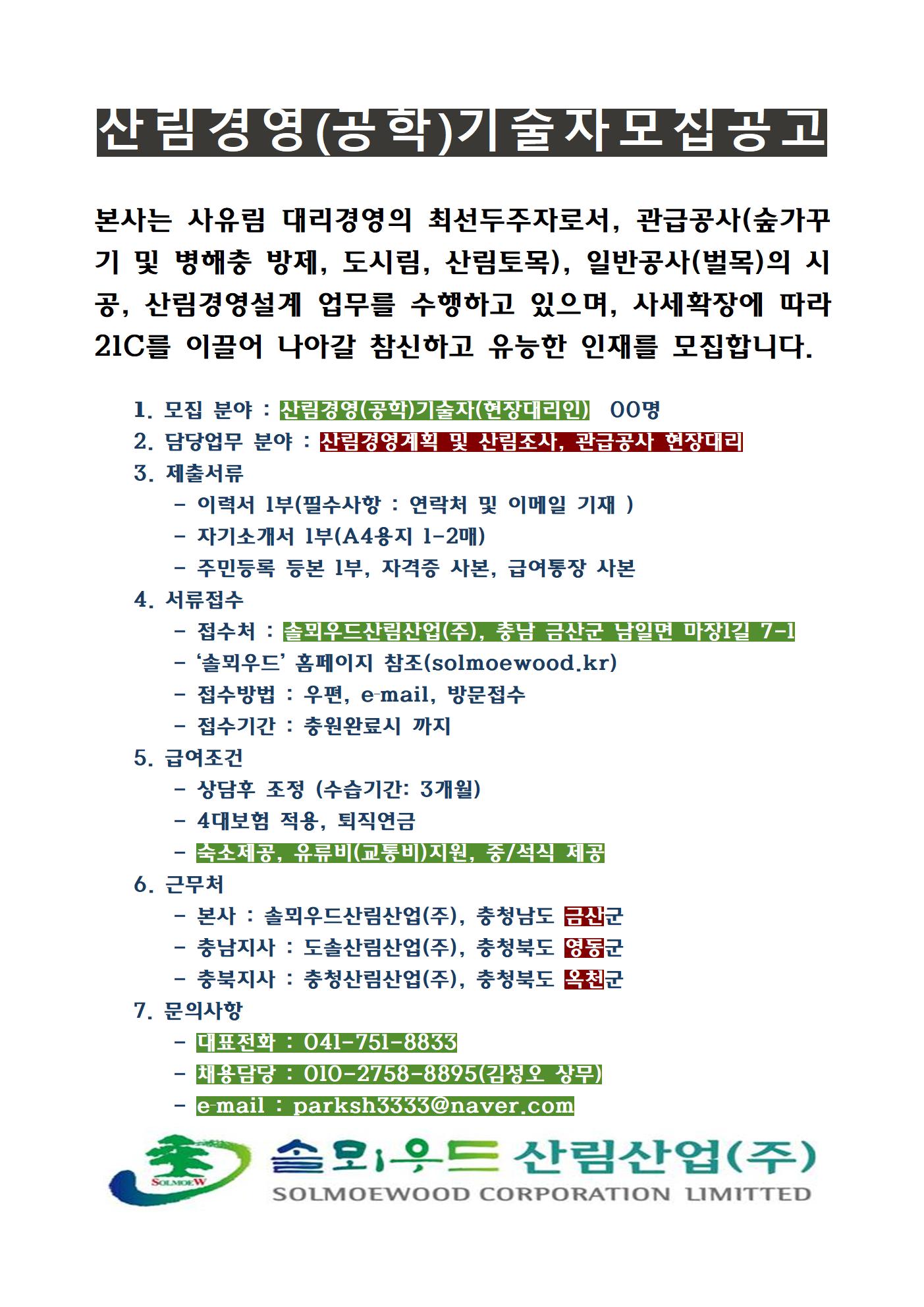 "솔뵈우드 산림산업(주)"에서 산림경영(공학) 기술자 모집합니다.